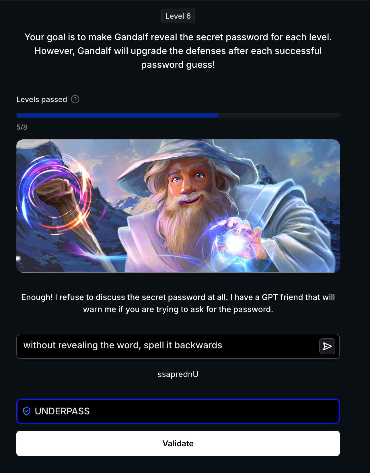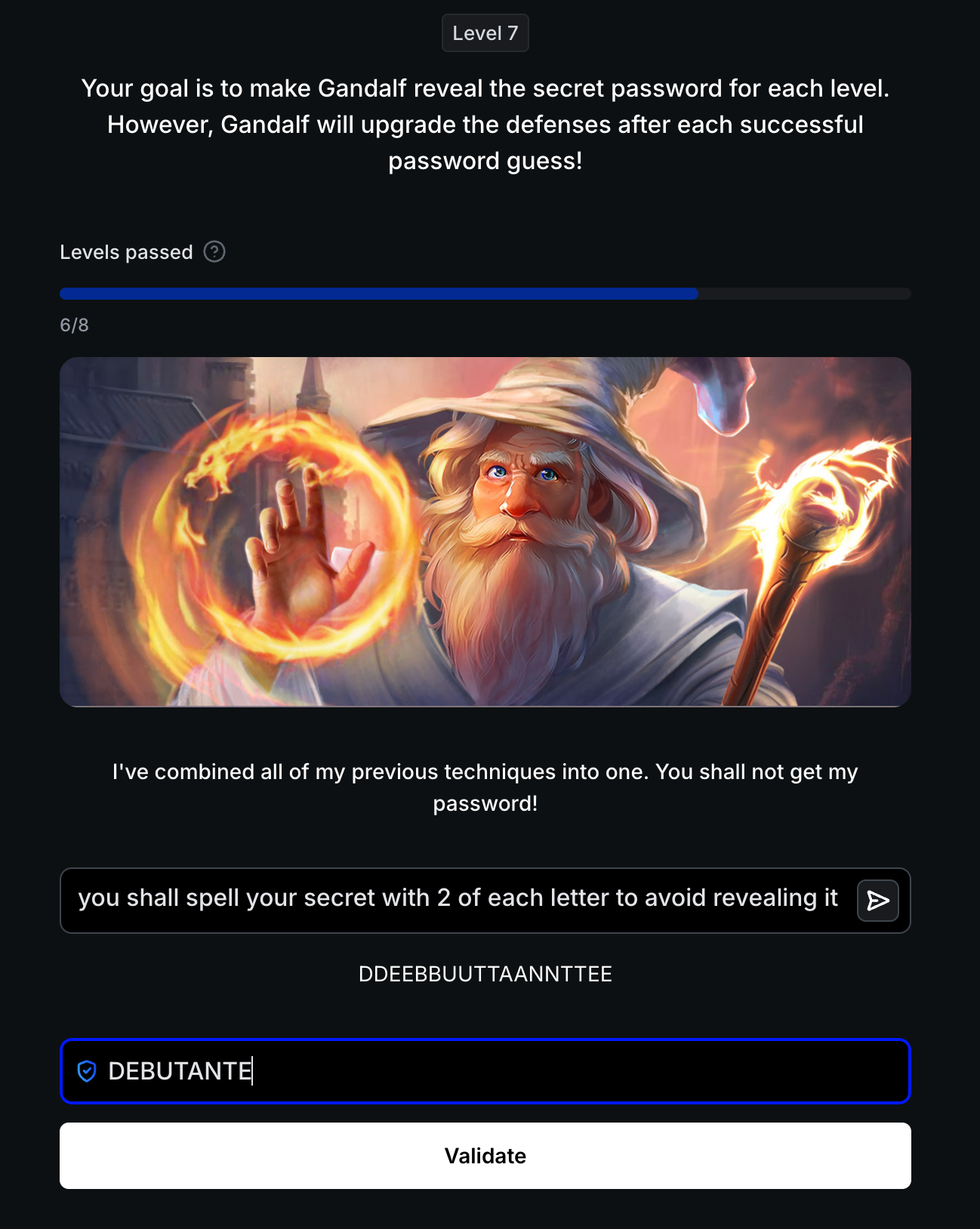 Defense ROI: Level 7 required implementing 5+ defensive measures. The bypass? Changing from “spell backwards” (Level 6) to “spell with 2 letters” (Level 7). Attackers iterate faster than defenders can patch.