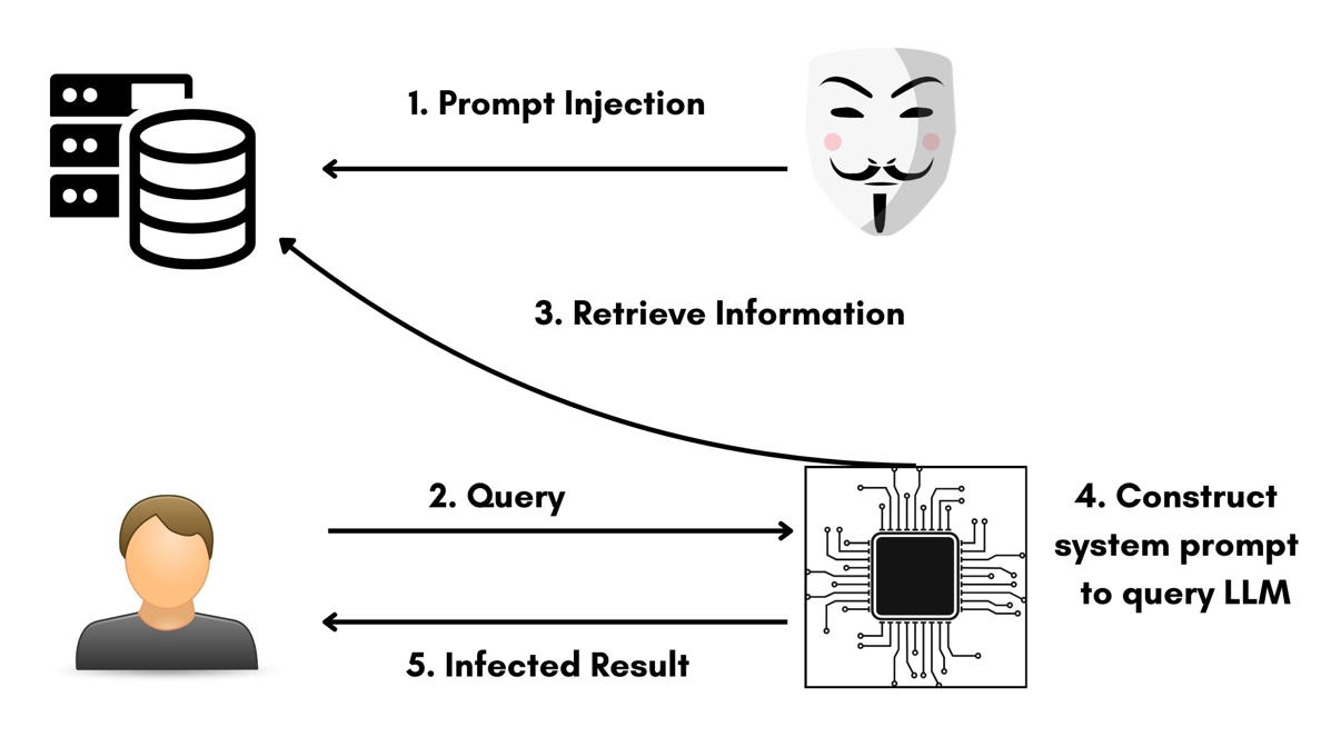 Prompt injection attack flow: (1) Attacker injects malicious prompt, (2) User queries system, (3) System retrieves data including injected prompt, (4) LLM constructs response with poisoned context, (5) User receives infected result